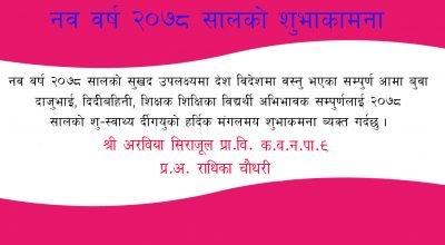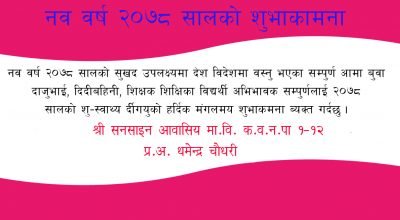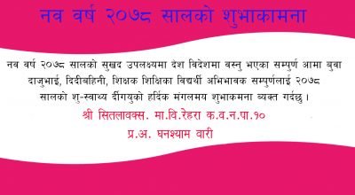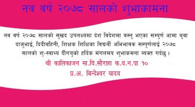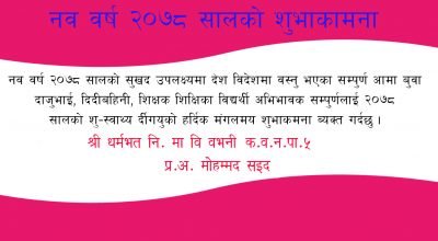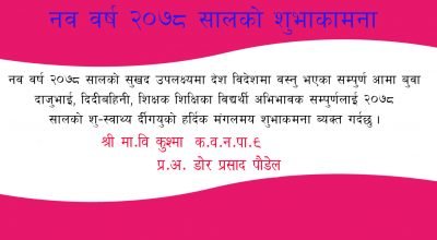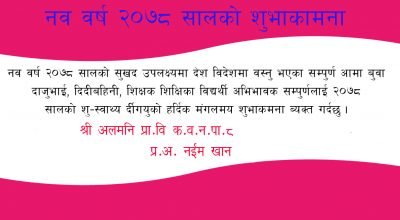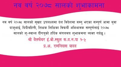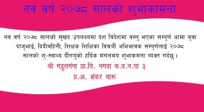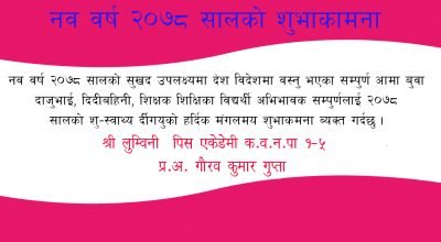New Year Ko Shuvkamana बुद्धभूमि विशेष ✍️ बुद्धभूमि संवाददाता प्रकाशित मिति ३१ चैत्र २०७७, मंगलवार १७:०६ 0 बाड्नुहोस् 0 बाड्नुहोस् FacebookTwitterGoogle+ReddItWhatsAppPinterestEmail