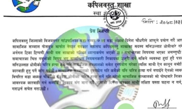 कपिलबस्तु शाखाका सदस्य पत्रकार सनिउल्ला धोबी माथि वडाध्यक्ष चौधरीले आफनो समाचार प्रसारण गरेको भन्दै सामाजिक सञ्जाल फेसबुकको दुरुपयोग गर्दै चरित्र हत्या गरेको भन्दै महासंघले कारवाहीको माग गरेको हो ।