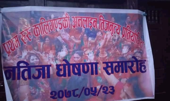 गुल्मी।महिलाहरुको महान पर्ब हरितालिका तिजको पावन अवसर पारी यस क्षेत्रमा पहिलो पटक आयोजना गरिएको खुल्ला अन्लाईन तिज नृत्य प्रतियोगिता २०७८ सामाजिक सन्जाल बाट नतिजा घोषण गर्दै सम्पन्न भएको छ । कला सस्कृति आफ्नो परम्परा रितिरिवाज लाई जोगाउन तथा कोभिट कारणले गर्दा यसरि अन्लाईन प्रबिधि बाट कार्यक्रम सन्चालन गरिएको रुरु सन्चार अन्लाईन खबर प्रा.लि का सम्पादक बिष्णु पाण्डेले जानकारी दिनुभयो।भदौ ५ गते देखि २३ गते सम्म सन्चालन भएको प्रतियोगितामा २२ जिल्लाका ३३० जना कलाकारहरुको सहभागीता थियो ।प्रतियोगितामा रुरु रिडी की दिपिका थापा, बिनिता चापागाइले प्रथम स्थान हासिल गर्नु भएको छ ।यस्तै कपिलवस्तु कि सोनिका पाण्डे द्दितिय र रुरु १ सातमुरेकि विहानी ज्ञवाली तृतीय स्थान हासिल गर्नु भएको छ।यस्तै प्रतियोगितामा २ जना कलाकारले सान्त्वना स्थान हासिल गर्नु भएको छ।तिलोत्तमा कि बर्षा भण्डारी र अस्लेवा चौरकि प्रिया मिदुन रहनु भएको छ।कार्यक्रममा जेष्ठ उमेर कि रमा पन्थ,बाल कलाकारमा छत्रकोट ४ कि अगृमा पन्थ, यस्तै मौलिक प्रतिभा पुरस्कार रुरु १ रिडी कि बिसाखा भुसाल,मौलिक सस्कृतिमा सिर्जनसिल आमा समुह सत्यवति १ अस्लेवा यस्तै उत्कृष्ट नृत्यमा पबित्रा सुर्य वंशिको टिम रिडी ले पुरस्कर जित्न सफल भएको हो ।रुरु धार्मिक सेवा सन्चार प्रालि रिडी र कालीगण्डकी पोस्ट डट्कम स्याङ्जाले संयुक्त रुपमा कार्यक्रम आयोजना गरेको रुरु सन्चारका अध्यक्ष चुरामणि तिमिल्सिनाले बताउनुभयो।कार्यक्रममा नतिजा सार्बजनिक गर्दै आयोजक सस्थाले सोचेभन्दा बढिको सहभागीता रहेको र आगामी दिनहरुमा पनि यस्तै सामाजिक सन्जाल भरिने खालका नौला कार्यक्रमहरु सन्चालन गरिने बताउनुभयो। यस्तै कालीगण्डकी पोस्टका सम्पादक यम सोमैले यो कार्यक्रम सफल पुर्याउन सहयोग गर्ने सबैलाई धन्यवाद दिदै केहि दिन भित्रमा रुरु सन्चार अन्लाईनखबर प्रा.लि को कार्यलय बाट पुरस्कर वितरण गरिने बताउनुभयो। भने कार्यक्रमको सहययोगि सस्था भने हिम श्री फुड्स प्रा.लि पोखरा रारा तैयारी चाउचाउ रहेको थियो।