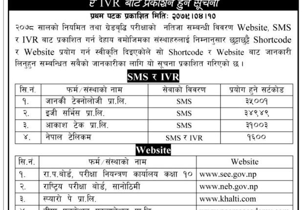 एसईईको नतिजा परीक्षार्थीले बोर्डको वेबसाइटका साथै एसएमएस र आइभीआरबाट पनि हेर्न सकिने व्यवस्था गरेको छ। परीक्षा नियन्त्रक कार्यालयले नियमित तथा ग्रेडवृद्धि परीक्षाको नतिजा वेबसाइट, एसएमएस र आइभीआरबाट हेर्न सकिने जानकारी दिएको छ।