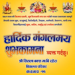 २०८१ सालको विजय दशमी शुभ दिपावली तथा छठ पर्बको शुभ कानमा Uncategorized ✍️ बुद्धभूमि संवाददाता प्रकाशित मिति २४ आश्विन २०८१, बिहीबार १६:१५ 0 बाड्नुहोस् 0 बाड्नुहोस् FacebookTwitterGoogle+ReddItWhatsAppPinterestEmail